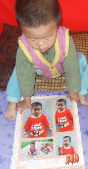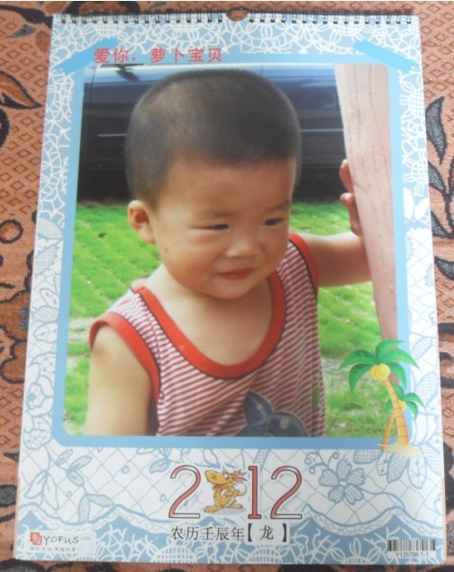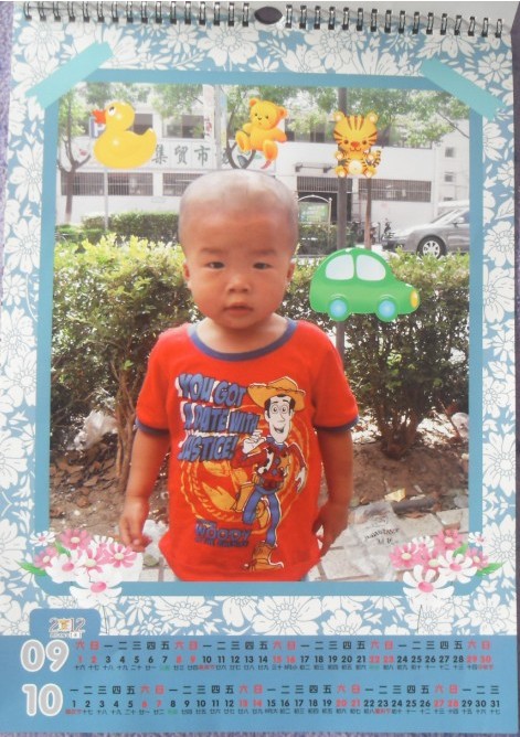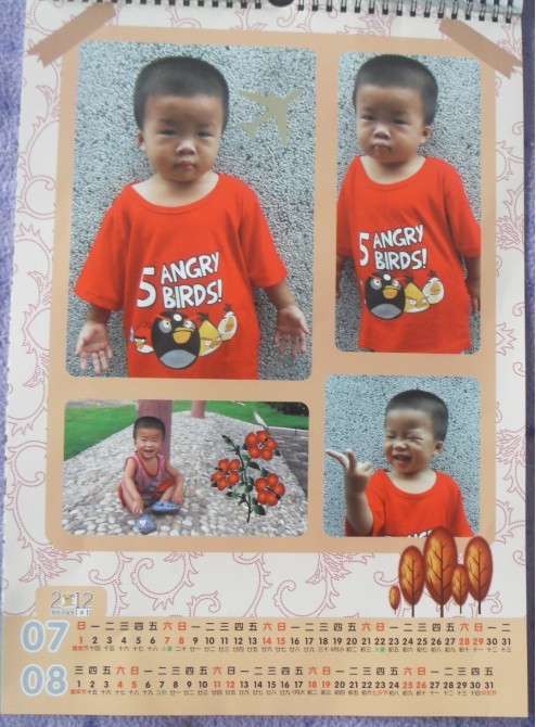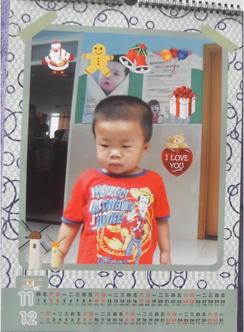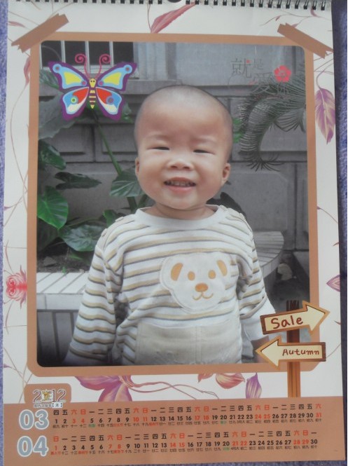 寶寶最初看到掛歷的時(shí)候,非常的開(kāi)心,一下就發(fā)現(xiàn)了自己的倩影,指著照片說(shuō),寶寶,寶寶,有別的小朋友想看的時(shí)候,他不干,過(guò)來(lái)扯,覺(jué)得是自己的東西。后來(lái)我又給寶寶看掛歷上的掛飾,寶寶認(rèn)識(shí)不少呢,笑聲不斷的爆發(fā)出來(lái),老公也對(duì)掛歷非常的滿意,用那張4格顯眼的紅照片,掛在墻壁上,為暗淡的屋子增添了很多色彩呢。