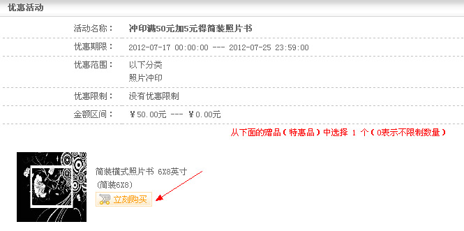 3、上傳照片后請勿急于下單,繼續(xù)制作簡裝橫式照片書 6X8英寸,制作完成后即可與照片一起下單,然后在優(yōu)惠活動中對剛剛制作好的簡裝橫式照片書 6X8英寸選擇立刻購買(如下圖),即可5元得照片書!