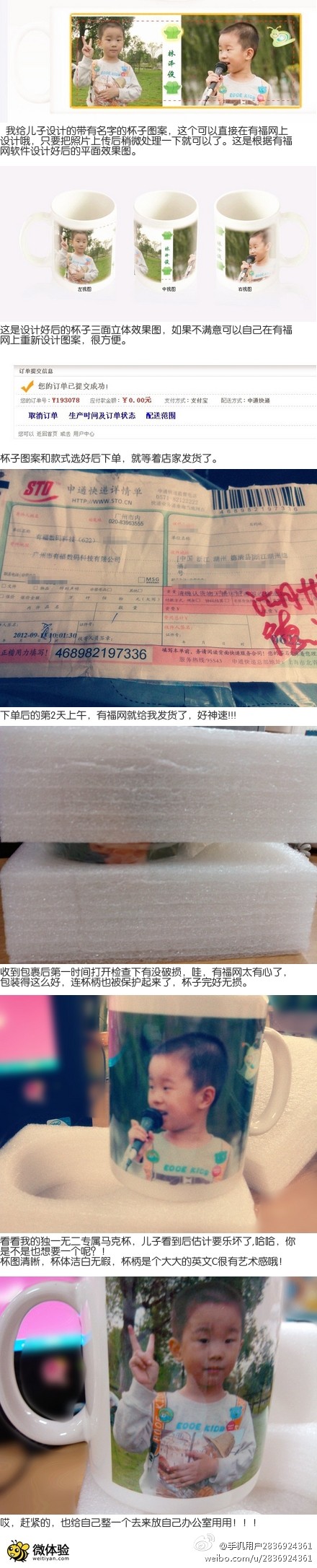 9月開(kāi)學(xué)了,兒子回家說(shuō)老師讓他們每人帶個(gè)杯子去學(xué)校用于喝水,湊巧康Q育兒論壇里正在開(kāi)展有福網(wǎng)DIY馬克杯體驗(yàn)活動(dòng),于是在12日下午報(bào)名,13號(hào)有福網(wǎng)已給我發(fā)貨,到了17號(hào)一上班就拿到了盼望已久的個(gè)性馬克杯,實(shí)在開(kāi)心,這禮拜兒子就可以帶著屬于自己的杯子去學(xué)校了。