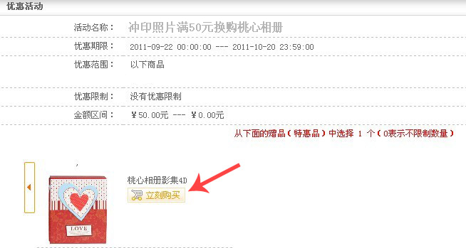 3、上傳照片后放入購(gòu)物車,在優(yōu)惠活動(dòng)中選擇立刻購(gòu)買(如下圖),即可5元得相冊(cè)!