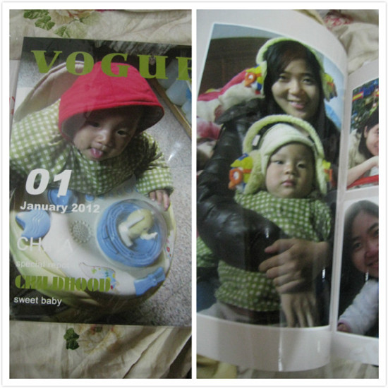 寶寶伸舌頭的這張照片,我把它用作了雜志的封面,因為覺得很可愛,特別淘氣的感覺,模板有點時尚的感覺,我非常喜歡,而且它幫我做了光面的,這種既可以防水,保存時間也可以更持久,等到寶寶長大了,照片的顏色也不會因時間的流逝而有所改變。第二張,很顯然的,便是我和寶寶的照片了,看到我和他都帶著親子的耳套,因為冬天冷的關(guān)系,更顯我對寶寶的愛,與寶寶對媽媽的信任。