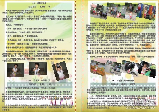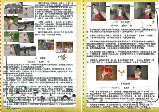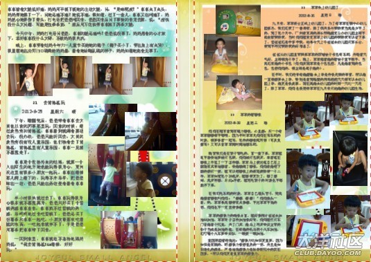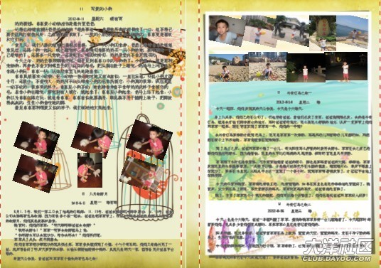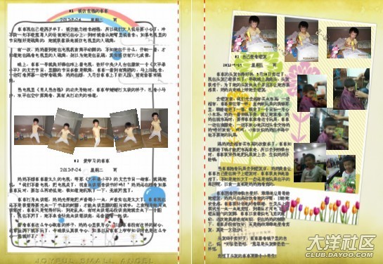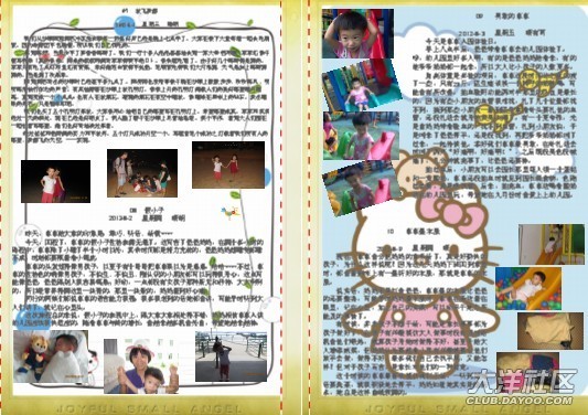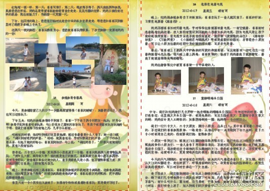 一開始做時,媽媽幾乎是一頁一篇日記,在做了10頁后,媽媽發(fā)現(xiàn)其實可以把內(nèi)容安排得更緊密些,只要把相片弄小一些,那樣就可以放更多的日記進(jìn)去。這時另外一個想法躍入腦海里,不如找些可愛的圖片做背景??墒且业胶每吹膱D片并不容易,媽媽花了很多時間去找圖片。