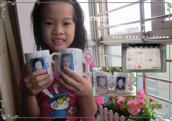 去年父親節(jié),給老爸老媽送了一對可愛的毛巾,兩條毛巾上面寫著“老媽辛苦了”“老爸受累了”,禮物雖小,老爸老媽看了非常開心。于是今年我又特意在有福網定做了一對印有老爸老媽相片的情侶杯,老媽看了樂的合不攏嘴,因為老一輩的她們不懂網絡,也不知道還有這樣印著自己相片的杯子,因此看了非常喜歡。而且杯子上不僅有他們本人的相片,我還放上了幾張他們從年輕到金婚的四張合影。就像上回為他們定做的記錄了他們一生的相冊書一樣,老媽感慨的說,還是女兒細心呀。古板而有點悶的老爸也難得的露出了欣喜的笑容。看著父母開心,就是做子女最大的幸福。