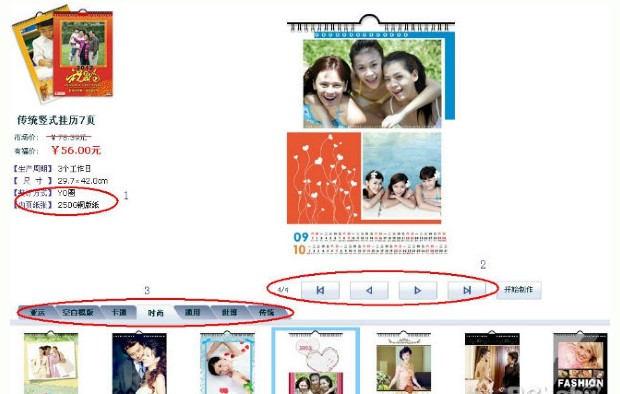 3、進(jìn)入之后,可以看到此類掛歷的介紹,1區(qū)域包括裝訂方式以及紙張,原來我做過印刷所以我知道250G銅版紙可是相當(dāng)厚的喲。然后可以在2區(qū)域選擇自己喜歡的模版,點(diǎn)擊一個(gè)就可以在右上方看到相應(yīng)模版的預(yù)覽。在3區(qū)域可以查看內(nèi)頁的照片布局情況。待選定了自己喜歡的,那么就可以開始制作了喲。