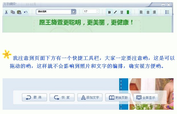 8、我注意到頁面下方有一個(gè)快捷工具欄,大家一定要注意喲,這是可以拖動(dòng)的喲,這樣就不會(huì)影響到照片和文字的編排,確實(shí)很方便喲。