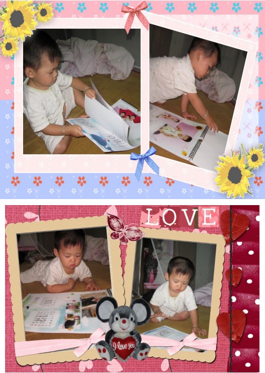 睿睿一看到掛歷就搶著要欣賞了,瞧瞧,多認(rèn)真呀,啥姿勢(shì)都用上了