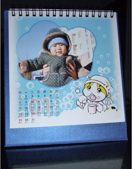 再說說臺歷,支架的紙板很厚很結(jié)實,表面還有一層略反光的貼膜紙,讓整個臺歷都顯得很高檔。上邊的翻頁圈也很結(jié)實,我捏了捏,都不會變形。臺歷的紙張也很厚,表面很白凈很光滑,一看就是好紙。印刷很清晰,顏色也很鮮亮,沒有色差,寶寶的照片在臺歷上顯得活潑可愛~~~