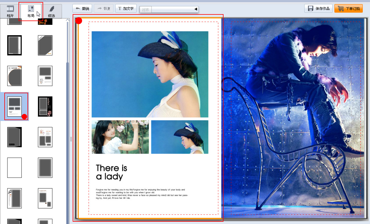 步驟六:個(gè)性內(nèi)容編輯。 照片調(diào)整&文字編輯&添加裝飾&布局&頁(yè)序調(diào)整