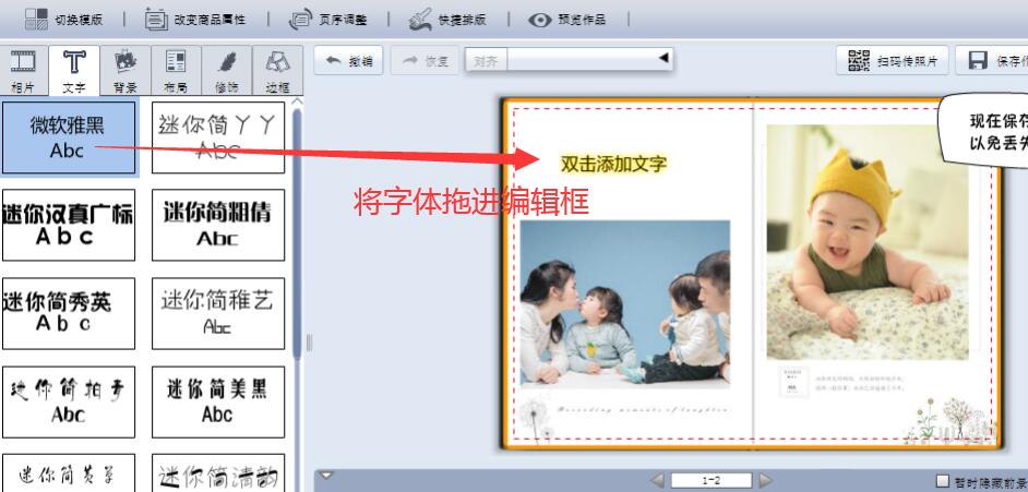 點(diǎn)擊“文字”按鈕將字體拖進(jìn)編輯頁(yè)面后雙擊輸入文字,再點(diǎn)擊添加文字文本框可以編輯字體、字號(hào)、顏色、對(duì)齊方式等
