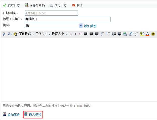 3、進(jìn)入MSN空間寫日志,選擇嵌入視頻;